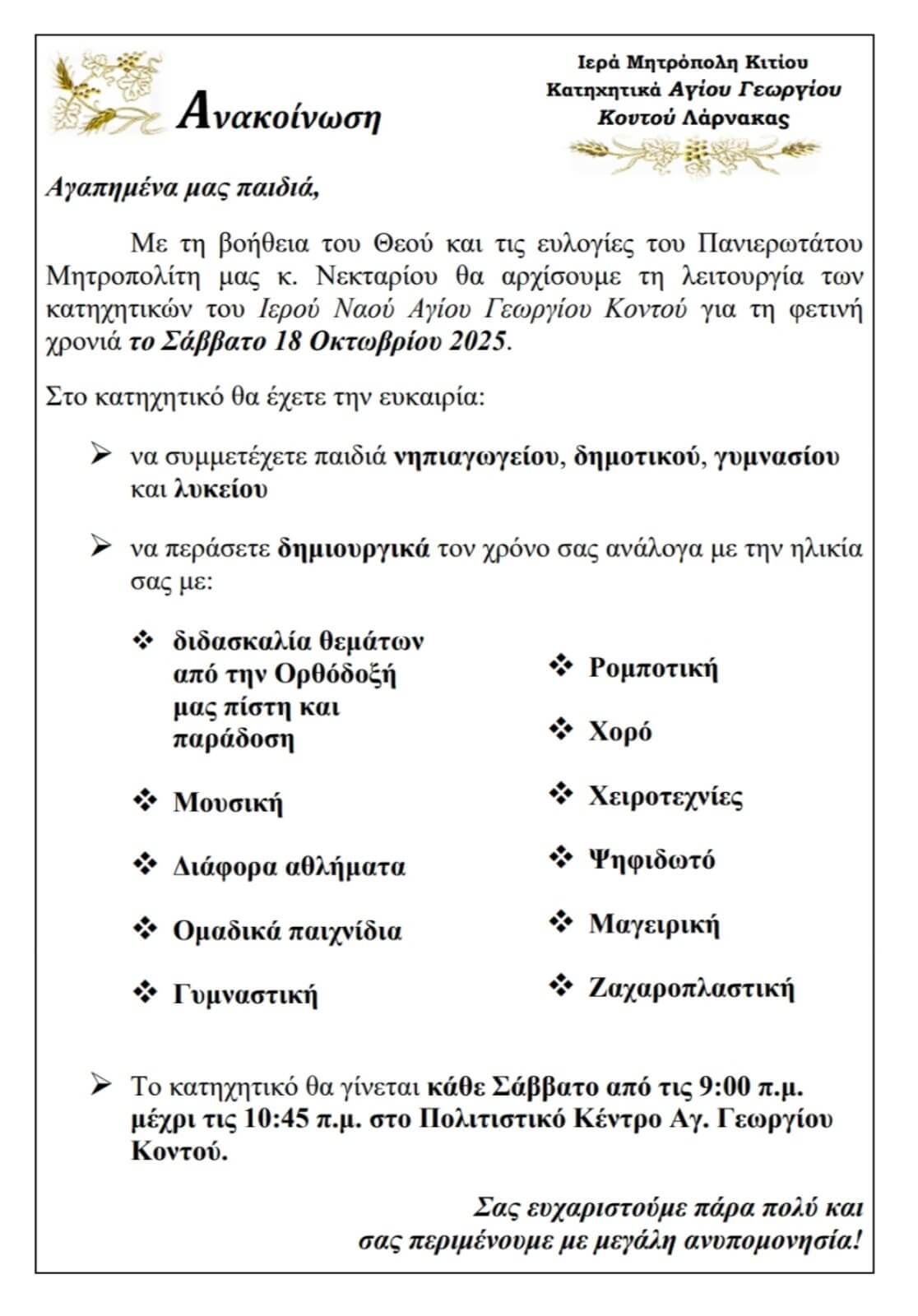 Έναρξη κατηχητικού Αγίου Γεωργίου Κοντού