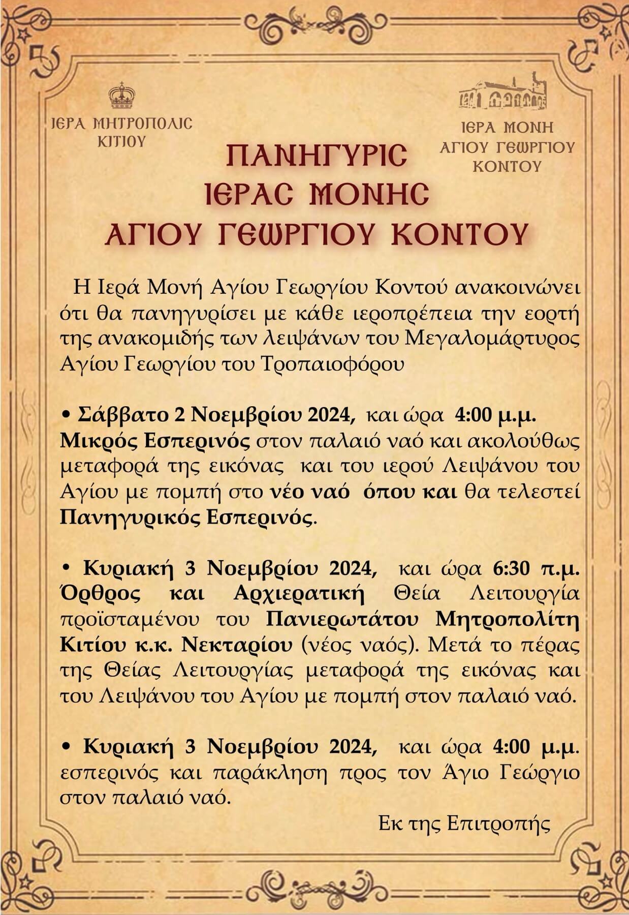Την Κυριακή της Τυρινής, 2 Μαρτίου 2025 και ώρα 17:00 το απόγευμα, θα τελεστεί στην Ιερά Μονή Αγίου Γεωργίου Κοντού (Μεγάλος Ναός) ο πρώτος Κατανυκτικός Εσπερινός (της Συγχωρήσεως) χοροστατούντος του Πανιερωτάτου Μητροπολίτου Κιτίου κ. Νεκταρίου.
